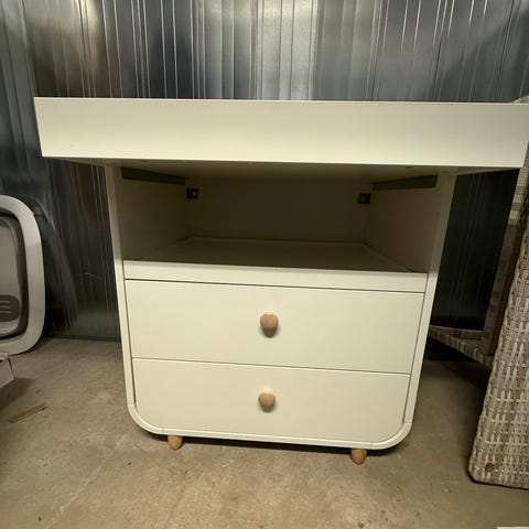 Säljer mycket fint skötbord från IKEA. Praktisk med två lådor för förvaring och går att använda som byrå när barnet blivit större.