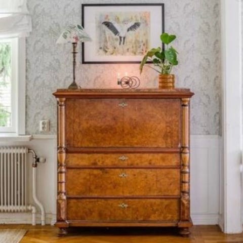 Chiffongjé i nyrenässansstil, troligtvis från slutet av 1800-talet. Den är tillverkad i valnöt eller mahogny och har en fällbar skrivskiva samt flera lådor