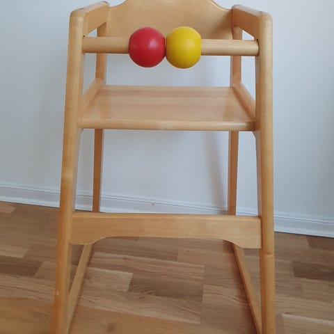 Mycket stabil barnstol med fotstöd och lekbollar som går att snurra på. Enstaka repor och någon diskret fläck från en tuschpenna, men i gott skick.