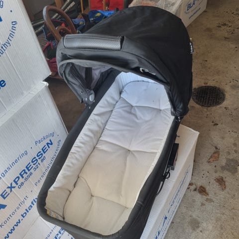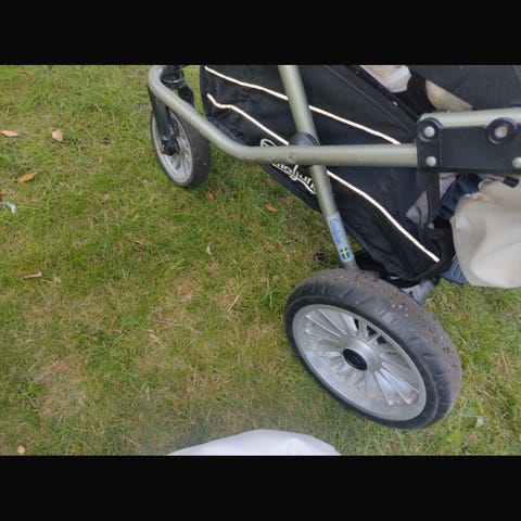 Klädsel och stomme i gott skick, men med slitna hjul, krånglande broms och en varukorg som sjunger på sista versen. Regnskydd medföljer, solskydd integrerat i sufflett.