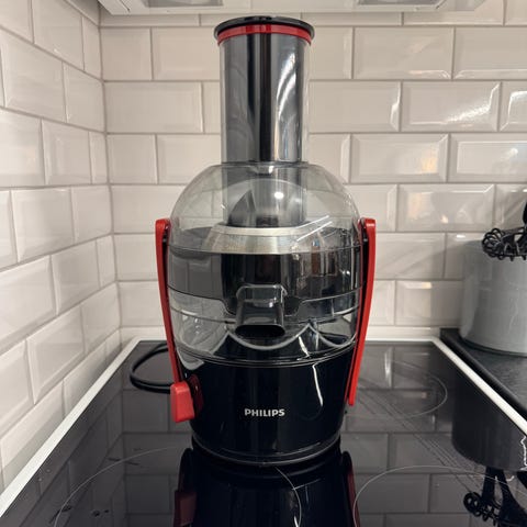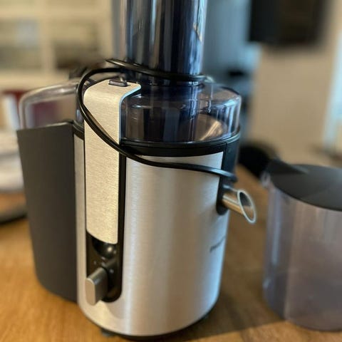 Philips råsaftcentrifug med ett genomskinligt behållarlock och vit kropp. Utrustad med en matningsrör och en kontrollvred för inställning av hastighet.