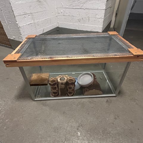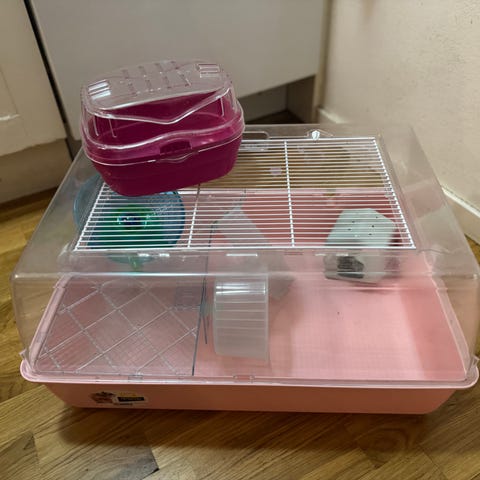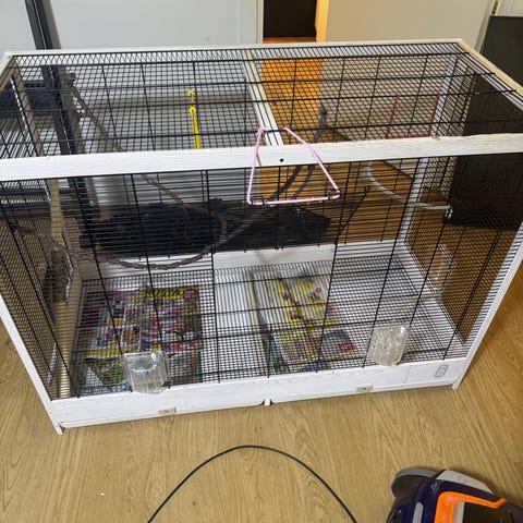 Bur med svart metallgaller och plastbotten, lämplig för smådjur. Följer med viss tillbehör.
