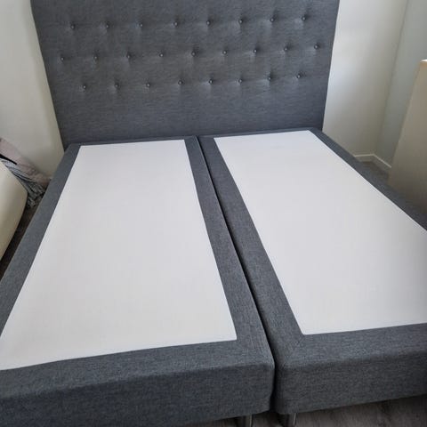 Säljer min Emma sängram i bra skick. Stabil och bekväm med stilren grå klädsel och stoppad gavel.