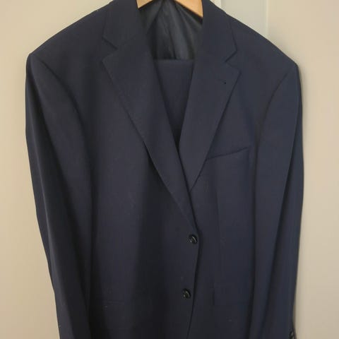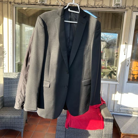 Dressmann Slim Fit kavaj i svart samt mörkblå, storlek 48 för herrar. Tillverkad av polyester, med slim fit-passform. Byxor i storlek 33-32.