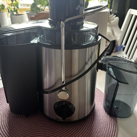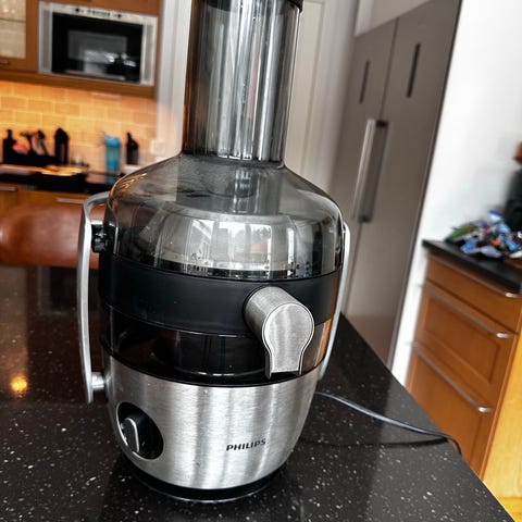 Philips juicer med rostfritt stål och plastdetaljer. Utrustad med en strömbrytare på fronten och en säkerhetslåsarm. Passar för att pressa juice från olika frukter och grönsaker.