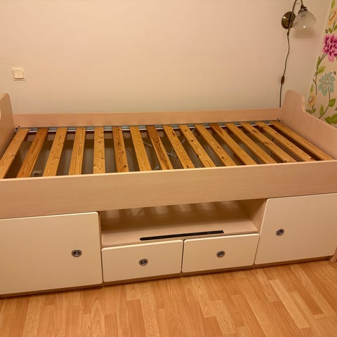 Medföljer en madrass från Ikea (Moshult) om så önskas. Vi har haft bäddmadrass på så ingen har sovit direkt på madrassen.
