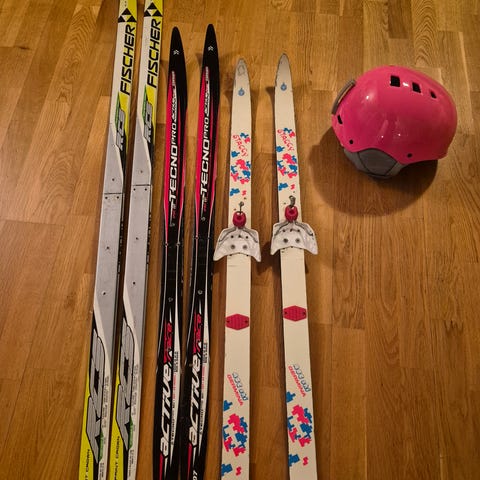Längdskidor barn 130 cm inkl pjäxor och stavar