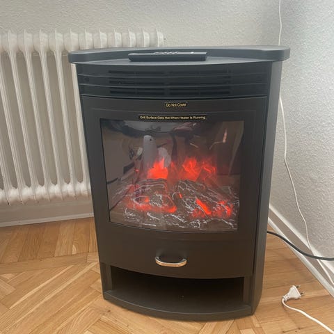 Elektrisk kamin i svart färg med glasdörrar och dekorativa rutmönster. Passar för inomhusbruk och ger en visuell effekt av eld utan verklig förbränning. Ger värme med motor som blåser varm luft.