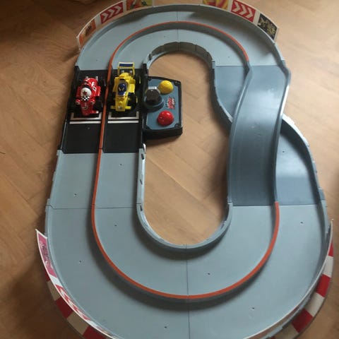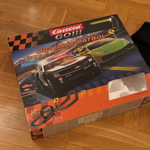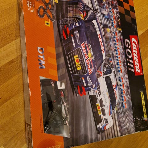 Carrera Go! Touring Stars radiostyrd bilbana set med två bilar, flera bansektioner inklusive kurvor och raksträckor, samt kontrollenheter. Setet är avsett för barn och erbjuder möjlighet till racing och lek.
