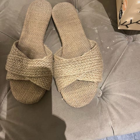 Arket Tofflor i storlek 38, gul färg och tillverkade i textilmaterial. Tofflorna har en öppen design och är avsedda för inomhusbruk. Använd fåtal gånger