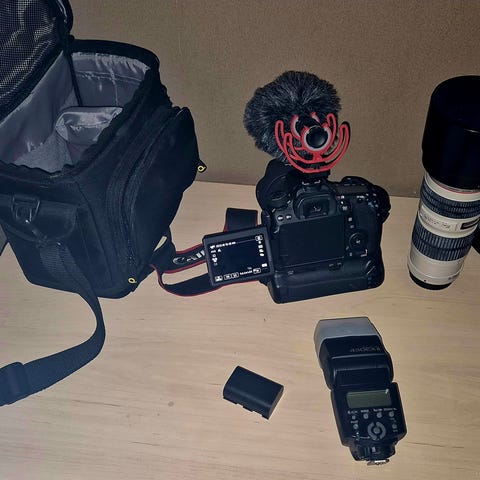 Canon EOS 80D systemkamera med vridbar skärm, medföljande objektiv, minneskort, batterier, laddare, kamerarem och stativ. Kamerahuset är svart och utrustat för fotografering och videoinspelning.