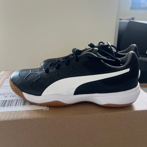 Puma inomhusskor i svart färg med vit logotyp. Skorna har snörning och en sula i ljusbrun/gum-material. Passar för inomhusaktiviteter.