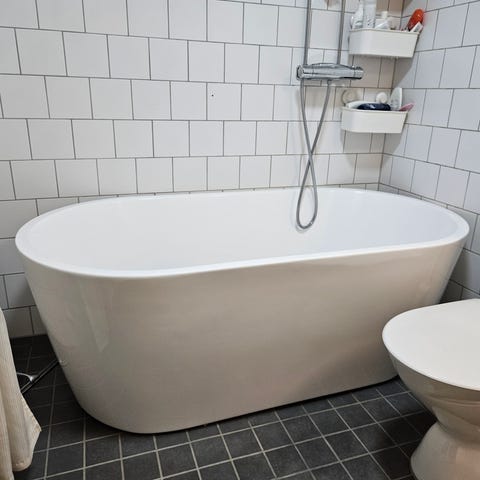 Fristående badkar i vit färg med oval form. Passar för badrum och erbjuder en rymlig badupplevelse.