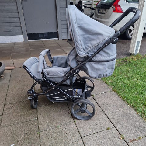 Emmaljunga barnvagn i blått. Barnvagnen har en robust ram och fyra hjul, med justerbart handtag och sufflett. Passar för barn och är lämplig för vardagligt bruk utomhus.