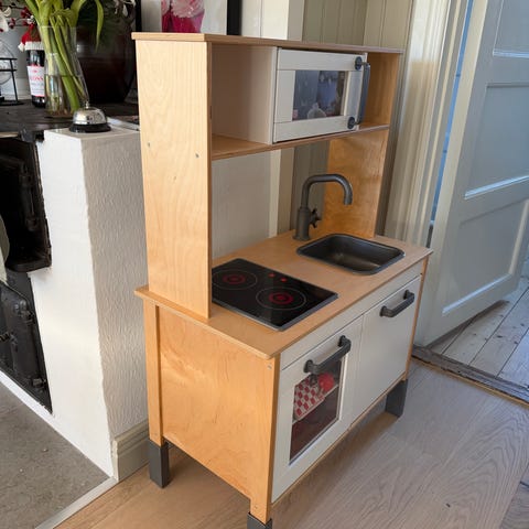 Kids Concept lekkök i trä med spis, ugn, två kokplattor och vask i rostfritt stål. Köket har en grå bänkskiva och vit stomme med öppna hyllor för förvaring. Passar för barn och är utformat för lek och kreativt spel.