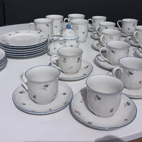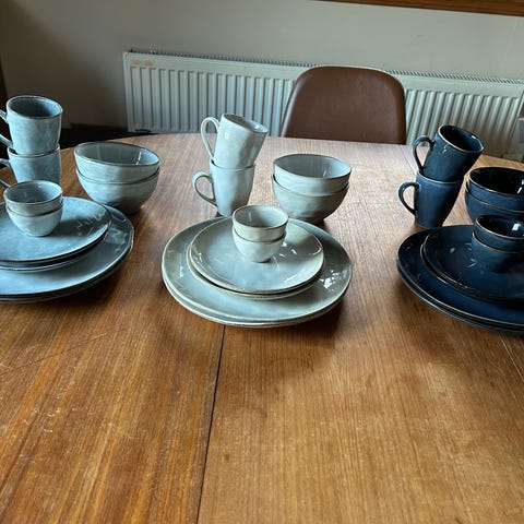 Servis från Duka i serien ”Ocean” i blå glasyr i 4 delar (4st koppar, 4st tallrikar 20cm, 3st tallrikar 26cm och 4 skålar).