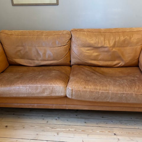 Bruna 3-sits och 2-sits soffor i riktig skinn. Sofforn har ett klassiskt och tidlöst utseende med breda armstöd och en robust konstruktion. Passar för vardagsrum och ger en bekväm sittplats för flera personer.