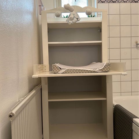 Vitmålat skötbord från IKEA, synligt använd men inget som påverkar funktionen. Skötbädd ingår ej.