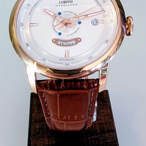 Elegant Lobinni armbandsur med automatisk urverk. Klockan har ett unikt motiv på urtavlan och en guldfärgad boett med infattade stenar. Armbandet är tillverkat av brunt läder och har ett guldfärgat spänne. Baksidan av klockan är genomskinlig, vilket ger insyn i det fantastiska urverket.