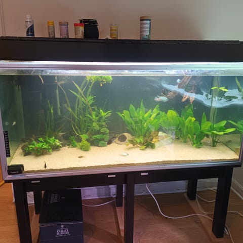 Akvarium med tillhörande inredning och fiskar