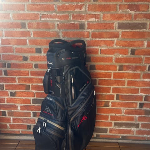 Big max aqua eight bärbag i svart och rött med flera fack och bärrem. Har uppdelade sektioner för golfklubbor och handtag för enkel transport. Dragkedjan på fram facket är sönder men det är igentejpat med eltejp