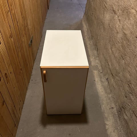 Vedum badrumsskåp i måtten b60 x d60 x h72 cm (utan ben) i vit färg. Skåpet är utan toppskiva, har två hyllplan och chrome beslag. Utsågad i baksida för sladdar och det finns skruvhål för benmontering. Inget trasigt och normalt slitage, så bedömer den i fint skick.