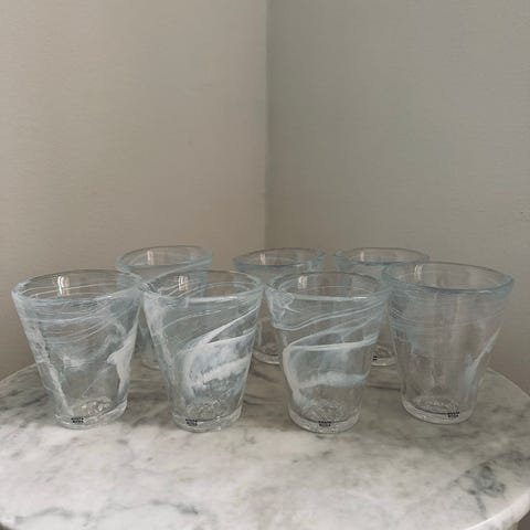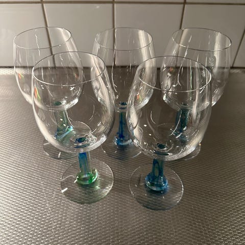 Kosta Boda glas set, bestående av tre delar i klart glas. Champange glas 9, vinglas 13, vattenglas 14 st var av 4 mjölkiga se bild på 4 glas. Av glas designer Bertil Vallien