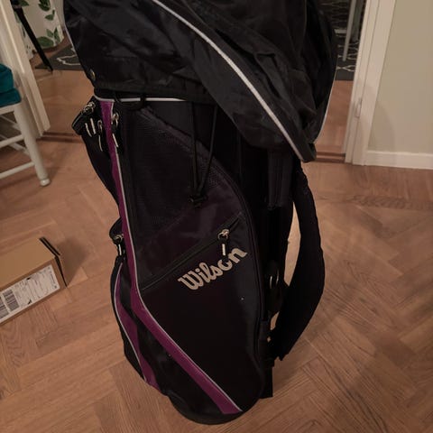Nike golfbag med flera fack och avdelare för golfklubbor. Färger: svart och grå. Material: textil och syntet. Designad för att underlätta transport och organisering av golfutrustning. De är en vagn bag