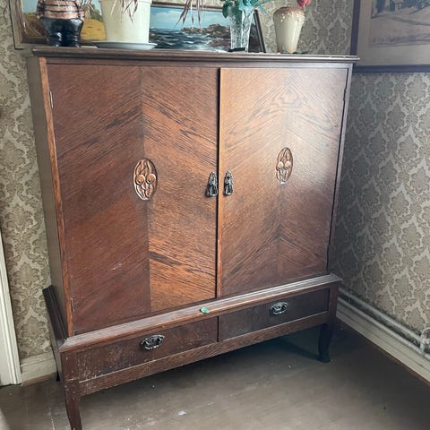 Träskåp med två dörrar och lådor i brunt trä