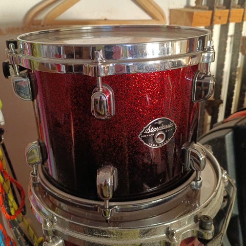 Ludwig Questlove Trumset Wine Red Sparkle. Setet inkluderar bastrumma, virveltrumma och häng och golvpukor. Bra kvalitet! Knappt använt och aldrig på ett gig. Låter som ett Ludwig ska, men litet o lätt att ta med på gig och få plats med hemma eller i replokalen. Nypris 7195, säljes för 4500. Låter grymt, kolla the Roots och Questlove på Jimmy Fallon show.
