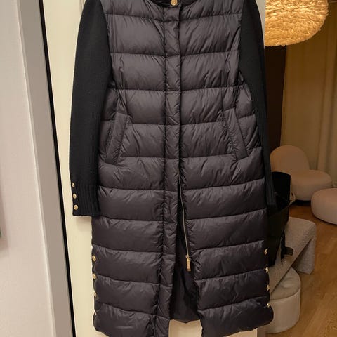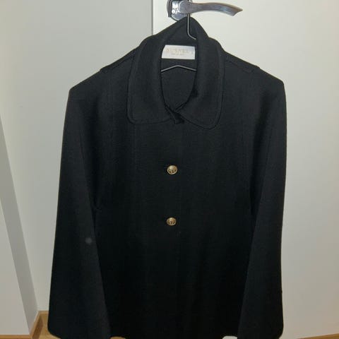 Övriga ytterkläder i marinblå färg, tillverkad i ullmaterial. Passar kvinnor i storlek 38. Plagget har dubbelknäppt design med guldfärgade knappar och detaljer på ärmarna.