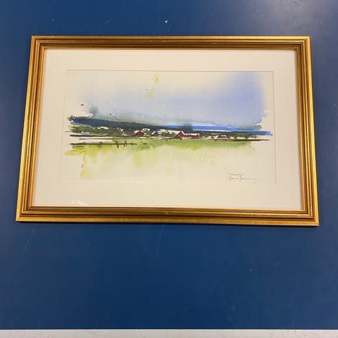 Else Uhlmann akvarellmålning från 1977 som föreställer ett hamnlandskap med båtar. Målningen är monterad i en vit ram med blå passepartout. Konstverket är signerat och har en etikett på baksidan med hennes kontaktuppgifter.