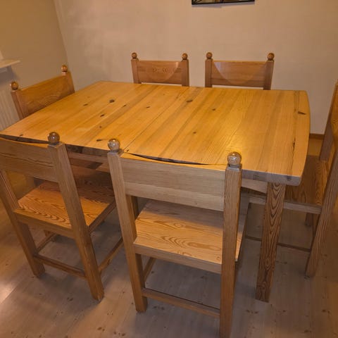 Matgrupp i massivt trä – bord med 2 iläggsskivor + 6 st stolar