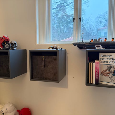 Säljer tre stilrena EKET kuber i mörkgrå färg. Mått per kub är 35 x 25 x 35 cm. Fästen medföljer så de enkelt kan monteras på vägg eller kombineras på annat sätt. Kuberna är i bra skick. Någon liten repa på en av dem.