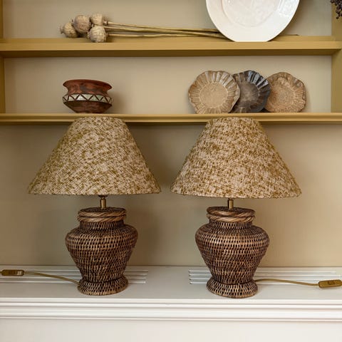 Fin bubblig lampfot med lampskärm i flätad rotting. Fint skick, säkert något brukslitage någonstans. Behöver torkas av bara så är den fin!