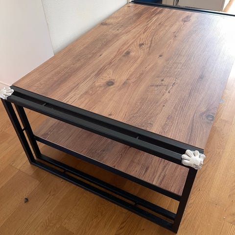 Soffbord med en skiva i frostat glas och en ram i metall. Bordet har en modern design med ett X-format underrede.