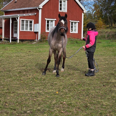 Snäll och lugn valack. Rids i alla gångarter i skog och mark av vuxen och 10 årigt barn. Är bara 4 år så endast grundriden. Har även varit på enstaka träningar/ridläger. Åker transport utan problem och är snäll i hantering och med hovslagare. Upplevs ganska hög men nätt i kroppen så vill nog inte ha för tung ryttare. Passar troligtvis bäst till äldre tonåring eller mindre vuxen. Vi rider western men vi tror han passar bra som allround häst. Vi säljer endast pga min dotter egentligen är för liten/ oerfaren för honom. Säljs bara om det känns 100% rätt för oss och utan massa krångel.