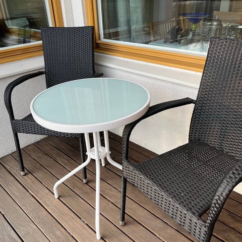 Utemöbelset i konstrotting bestående av en soffa, två fåtöljer och ett glasbord. Möbelsetet har dynor i ljus färg och är avsett för utomhusbruk.