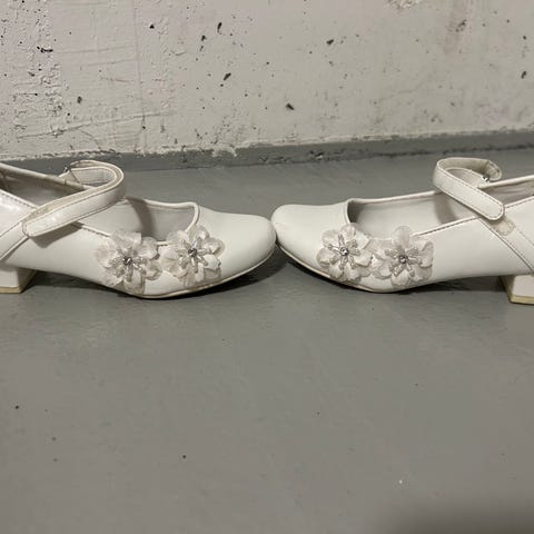 1. Barnskor med dekorativa blommor framtill i bra skick. Passar bra till fest, dop eller skolavslutning. Lätt slitage framtill (se bild). Storlek 29