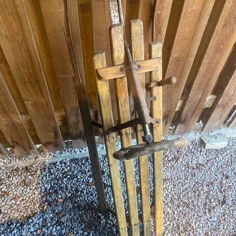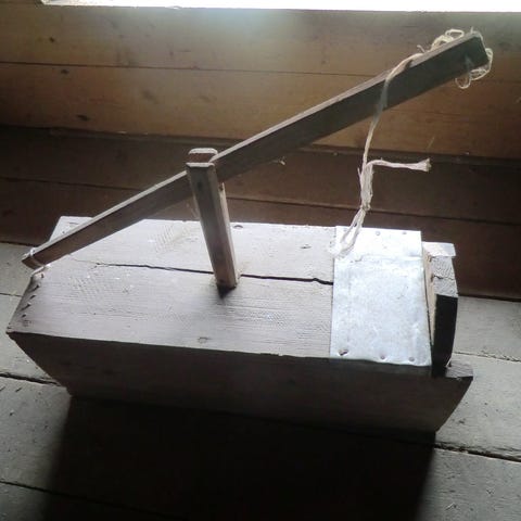 Träpall tillverkad i massivt trä med robust konstruktion. Pallens yta visar tecken på användning och har en inskription med årtalet 1987. Passar som sittplats eller som ett litet bord.