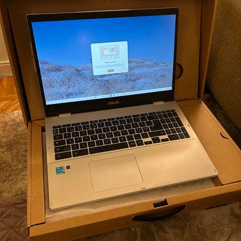 Acer Chromebook laptop i silver färg. Utrustad med ett tangentbord och pekplatta, lämplig för allmän användning och surfning på internet.