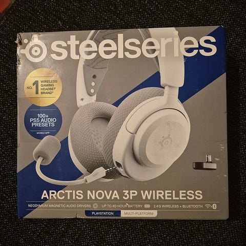 Säljer mitt SteelSeries Arctis Nova Pro Wireless gamingheadset i vit färg, kompatibelt med PC och PlayStation 5.