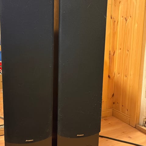 Först mina trotjänare till högtalare. Fina golvare från Dynaudio. Haft dem i ca 15 år nu och trodde egentligen inte jag skulle byta ut dem. Spelar riktigt trevligt. Negativa är att fanéren blivit lite solblekt på sina ställen över åren. Och att den finns två små jack i upphängningen på ett element. Men har limmat det med elsstiskt lim och inte märkt att det påverkar ljuden.