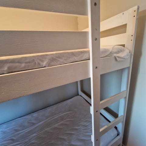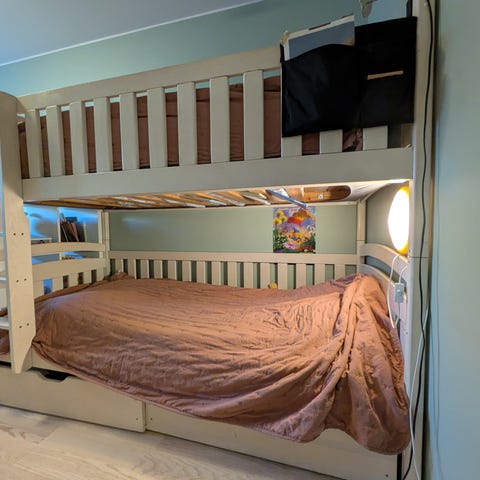 Våningssäng i fint skick, sängen har en tillbyggd träskiva på fotändan så att det ser ut som ett hus. Det kommer finnas märken där man fäst med spikar när man sätter ihopa våningssängen, dessa är inget som syns om man sätter ihop den igen. Sängen är ca 1,5 år gammal och kommer från djur och rökfritt hem. De två sänglådorna ingår.