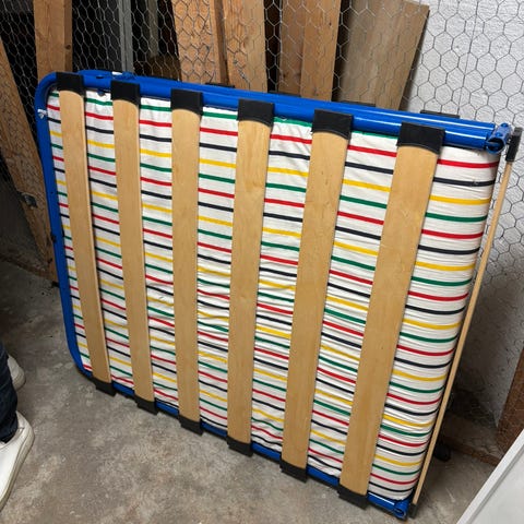 Hopfällbar extrasäng 80*190 cm. Hopfälld är den 80 cm bred, 110 cm hög och 30 cm djup. Madrassen är 10 cm tjock. Mycket fint skick. Den har stått undanställd länge och jag kan inte minnas att vi använt den, i så fall bara någon enstaka gång. Den har stått övertäckt och är inte dammig eller fläckig.