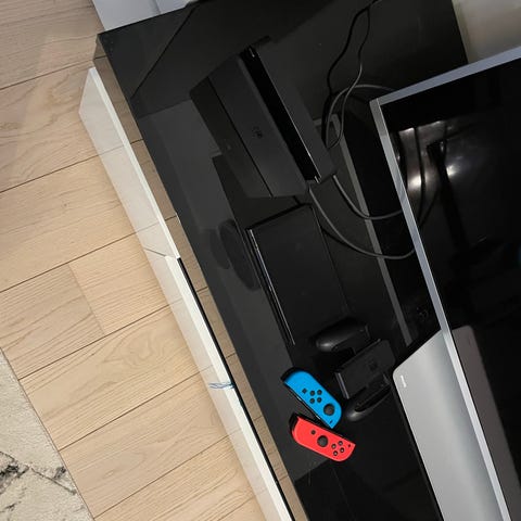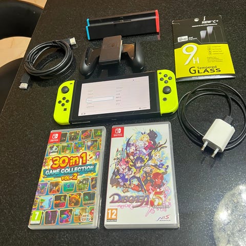 Nintendo switch med två fungerande spelkonsoler plus ett joy-con fäste.
