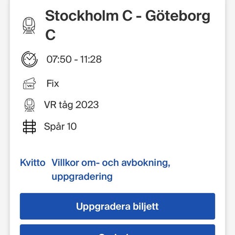 Biljetten kan inte återköpas och jag ersätter inte dig om SJ inte kör. Resan säljes eftersom min resa ner blev inställd på grund av oväder. Priset är detsamma som jag köpte resan för. Biljetten kan inte delas i två biljetter/ej säljas för halva priset.