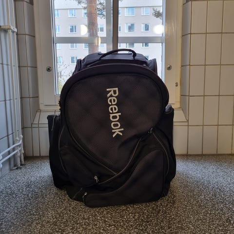 Stor ryggsäck som rymmer all utrustning. Separata fack för skridskor. Ventilerat fack i locket. Alla blixtlås och spännen fungerar. Äldre modell i gott skick. Hämtas i Uppsala, kan även skickas.