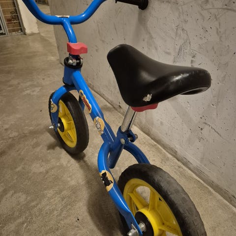 Barncykel med ram i blå färg och gula detaljer inklusive sadel och handtag. Utrustad med 10-tums hjul och stödhjul för extra balans. Passar för yngre barn som lär sig cykla.