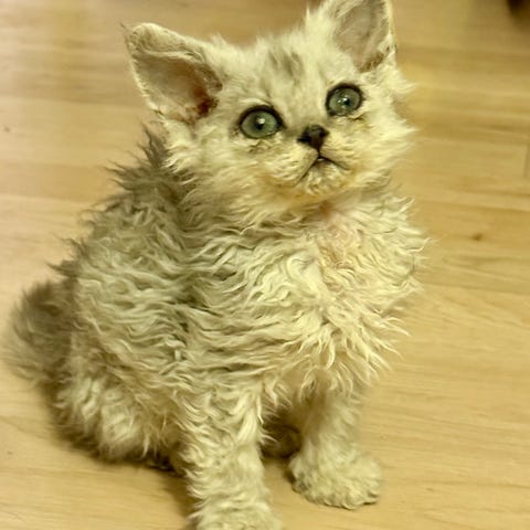 Selkirk Rex har en lockig päls som ras. Kattungen har heterozygot vilket betyder att hon har en uppsättning rak päls och en uppsättning lockig päls. Du kan läsa mer på Rexringen.se
